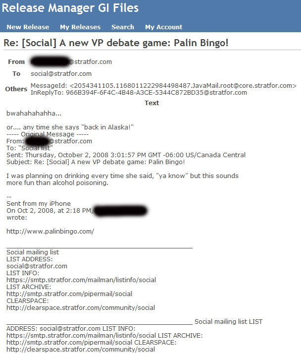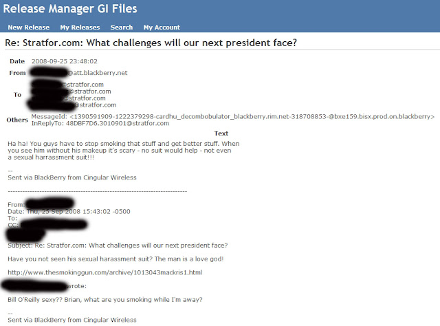OK, here it comes, the most embarrassing email. Some people at Strafor find the Palin-retarded-vagina joke hilarious. I could not see any "protest" as well. Political correctness just died a very cruel death.