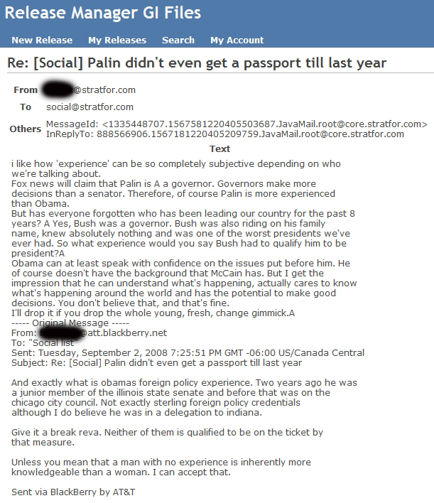 But then came the surprise: The Stratfor people did not hold back about Sarah Palin. What the American mainstream media sometimes had difficulty to express, due to legions of fanatical fans who defended Sarah and due to the desire to be "balanced", many Stratfor employees said openly, already in 2008: This woman is an idiot, and you simply cannot vote for her, as she is not fit to be the US President.