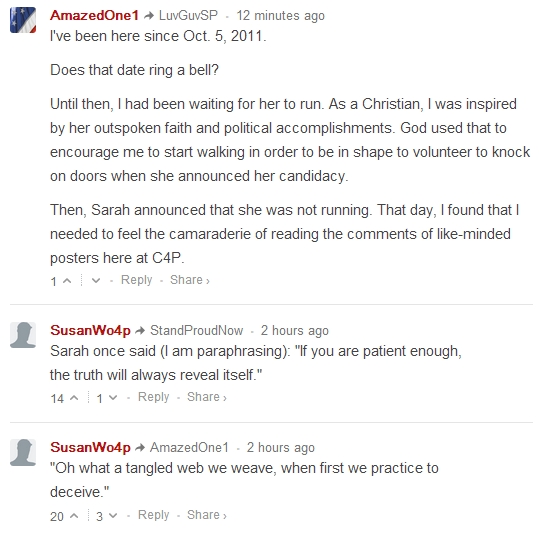 I would like to conclude this post with some screenshots of recent comments at "Conservatives4Palin", where some commenters "boldly" exposed a long-time member of the C4P-community as a potential "Trig Truther" - it was a hoot! The "exposed member" dared to ask in 2011 at Greta Van Susteren's blog in a comment why Sarah Palin won't provide the birth certificate for Trig! This of course constituted "high treason", and the Palin-fans were up in arms after the "discovery."